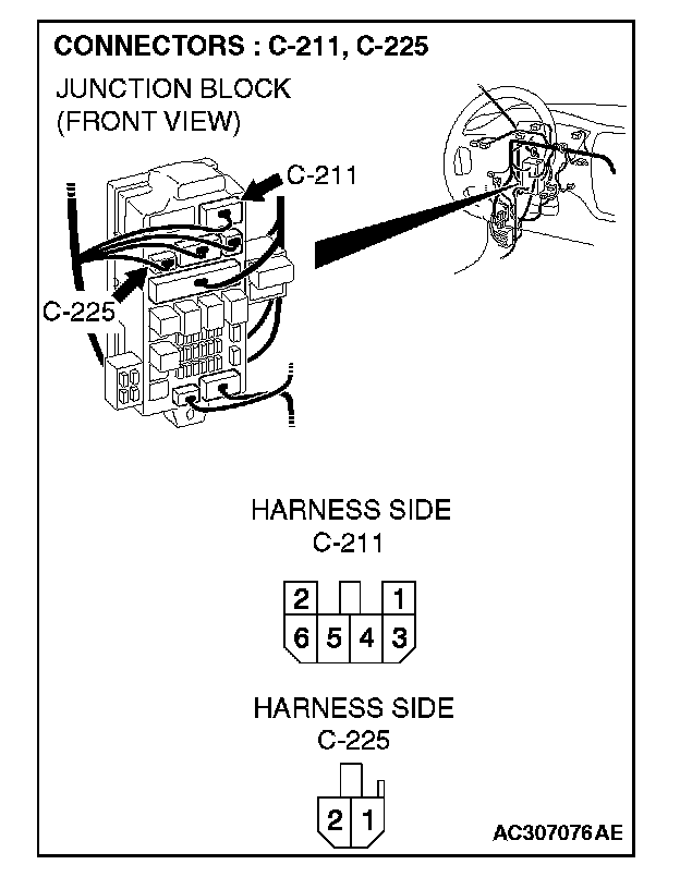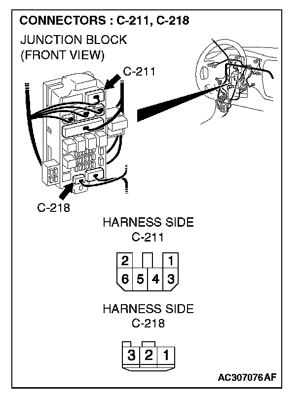 NOTE: Also check junction block connectors C-211 and C-218 for loose, corroded, or damaged terminals, or terminals pushed back in the connector, check the wires. If junction block connectors C-211 or C-218 are damaged, Repair or replace the damaged component(s) as described in Harness Connector Inspection.