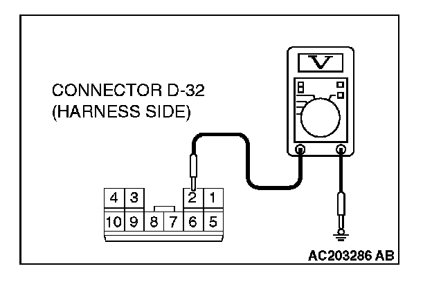 1. Disconnect sunroof motor assembly connector D-32 and measure the voltage available at the wiring harness side of the connector.