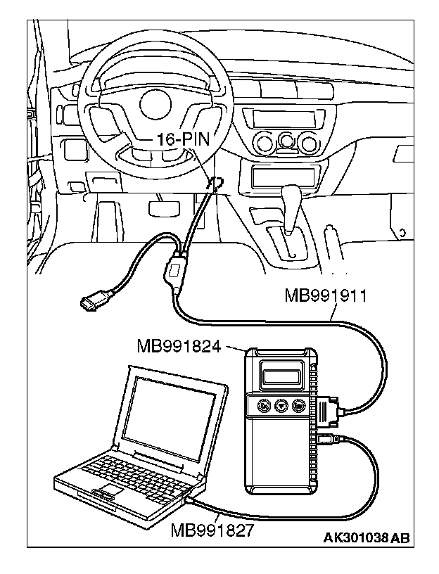 CAUTION: To prevent damage to scan tool MB991958, always turn the ignition switch to the "LOCK" (OFF) position before connecting or disconnecting scan tool MB991958.