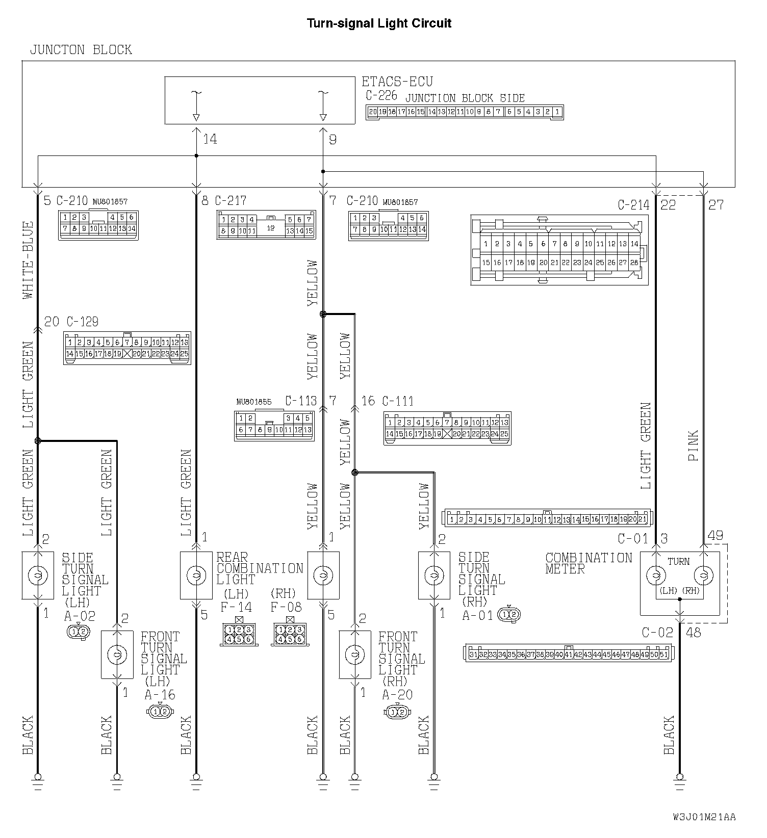 STEP 23. Check the wiring harness between side turn-signal light (LH) connector A-02 (terminal 2) and ETACS-ECU connector C-226 (terminal 14).