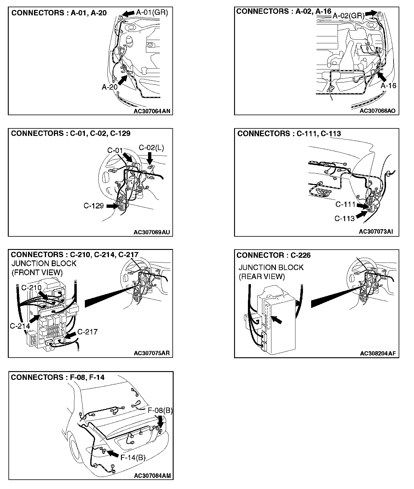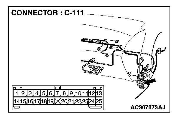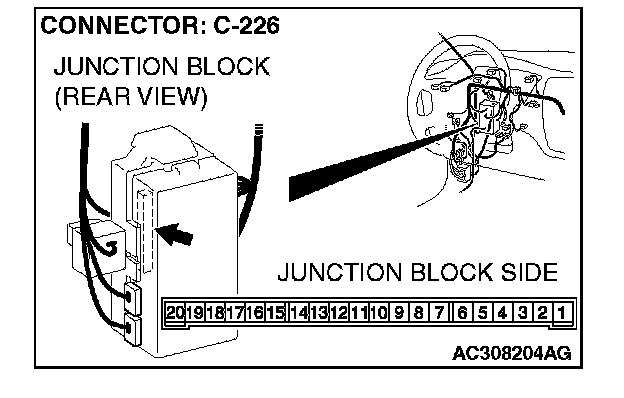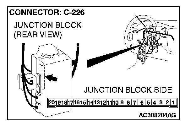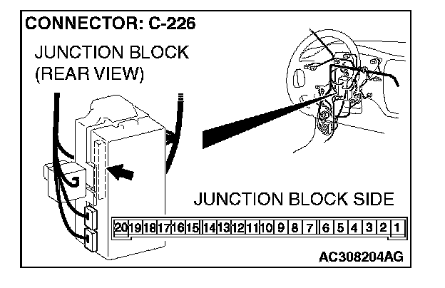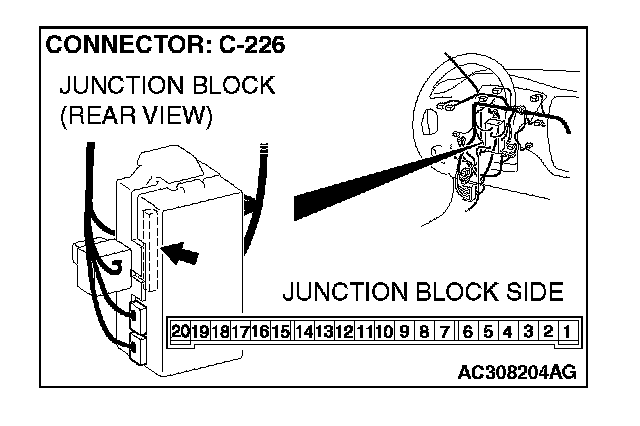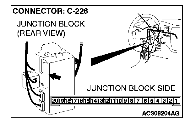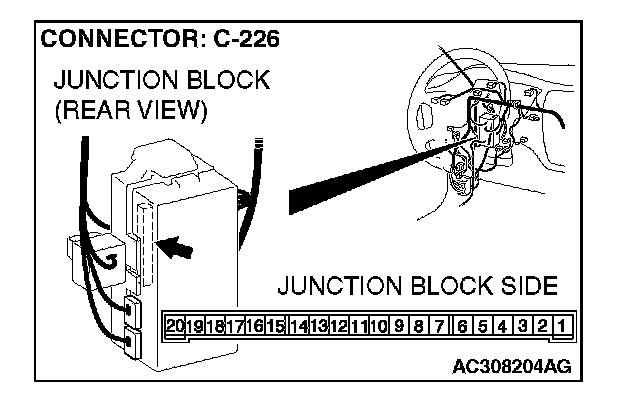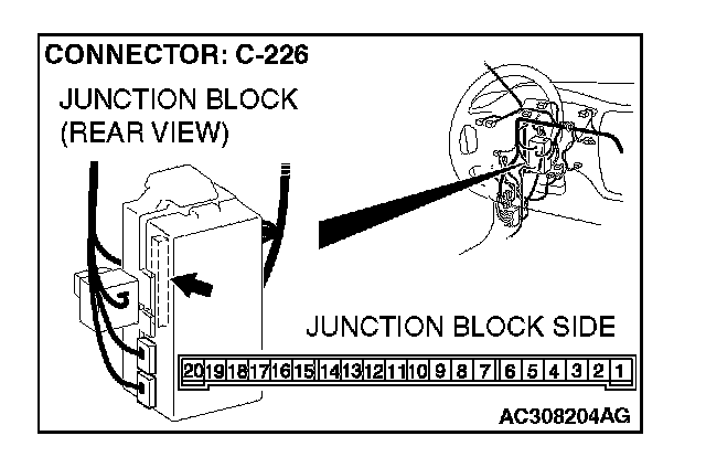 STEP 4. Check front turn-signal light (RH) connector A-20 and ETACS-ECU connector C-226 for loose, corroded or damaged terminals, or terminals pushed back in the connector.