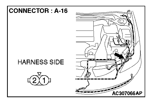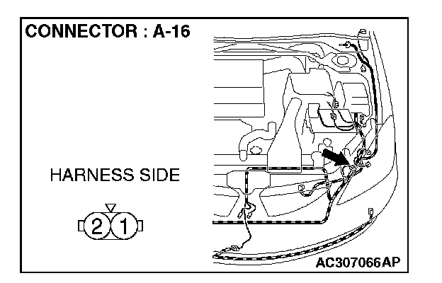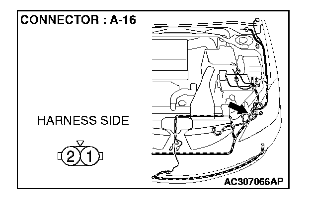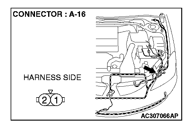 1. Disconnect front turn-signal light (LH) connector A-16 and measure the resistance available at the wiring harness side of the connector.