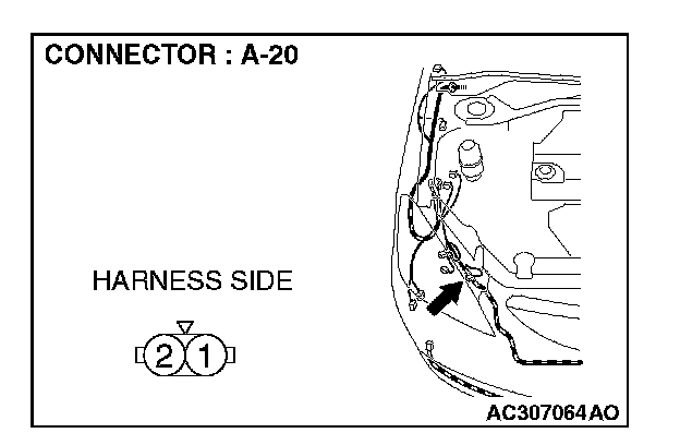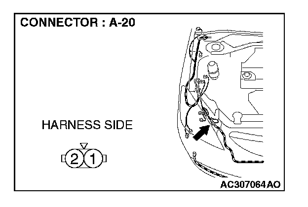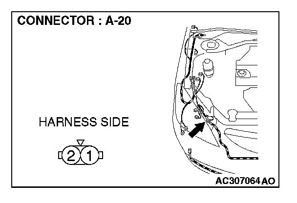 1. Disconnect front turn-signal light (RH) connector A-20 and measure the resistance available at the wiring harness side of the connector.