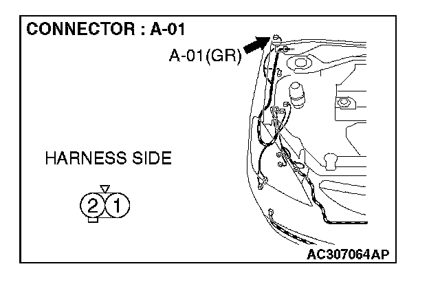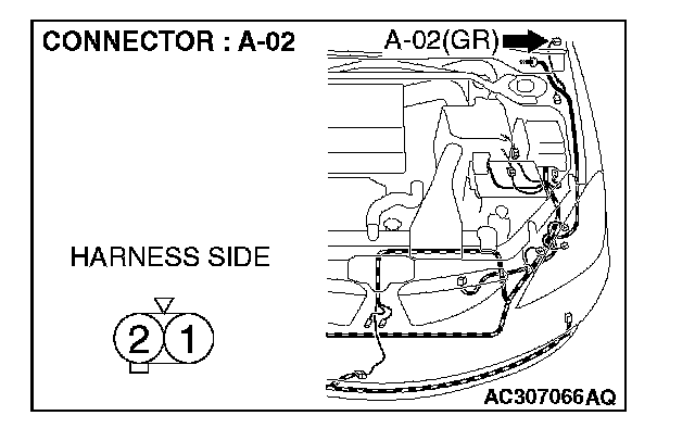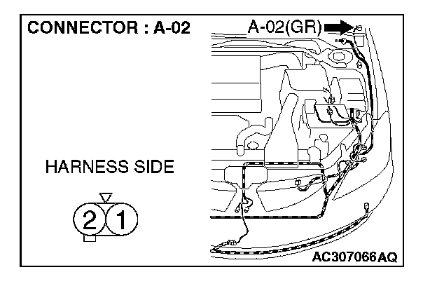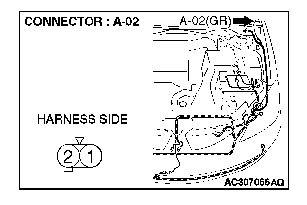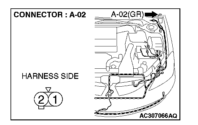 1. Disconnect side turn-signal light (LH) connector A-02 and measure the resistance available at the wiring harness side of the connector.
