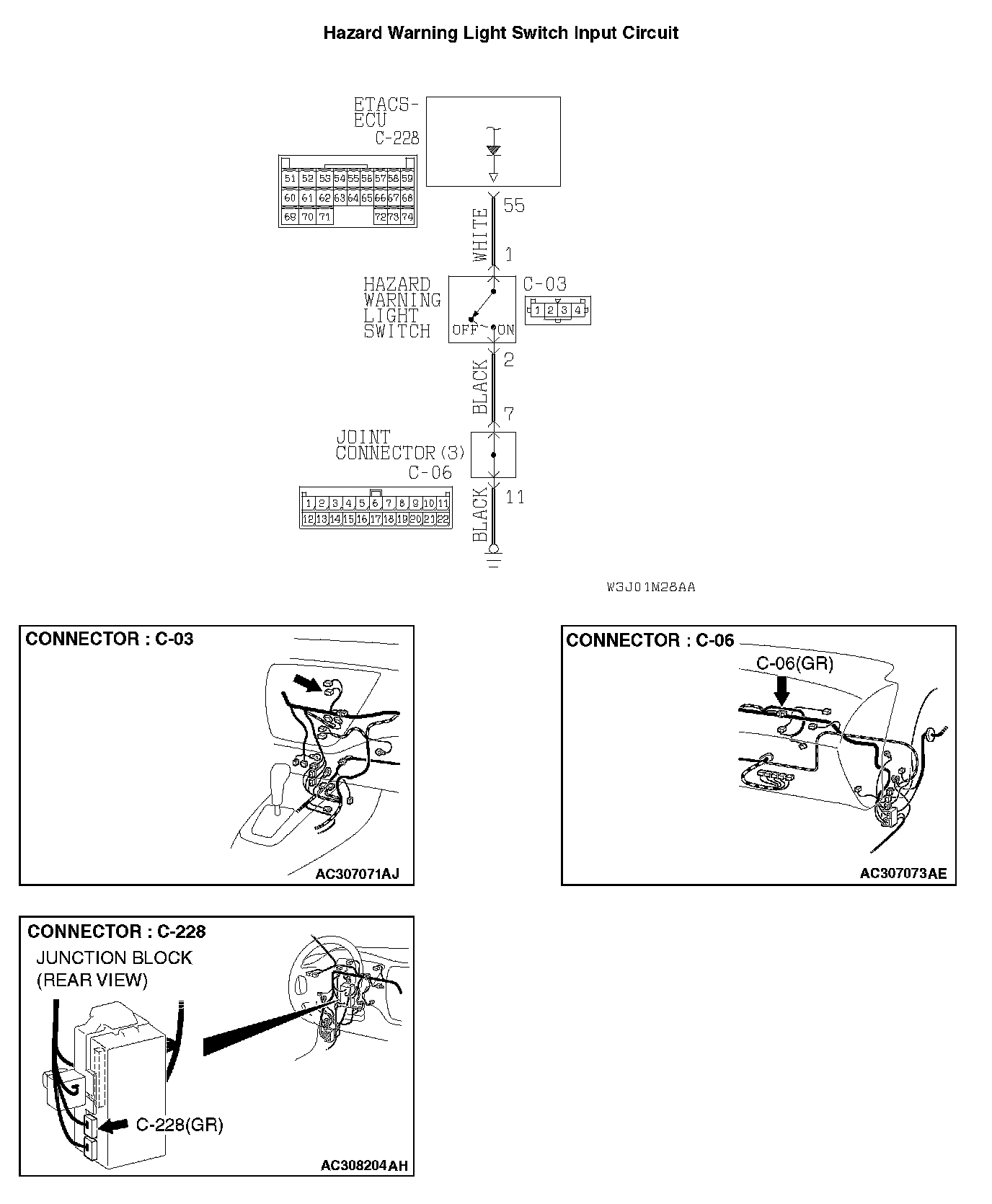 STEP 6. Check the wiring harness between hazard warning light switch connector C-03 (terminal 1) and ETACS-ECU connector C-228 (terminal 55).