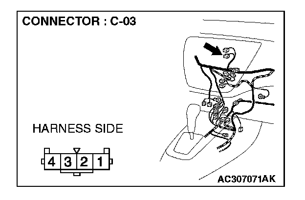 1. Disconnect hazard warning light switch connector C-03 and measure the resistance available at the wiring harness side of the connector.