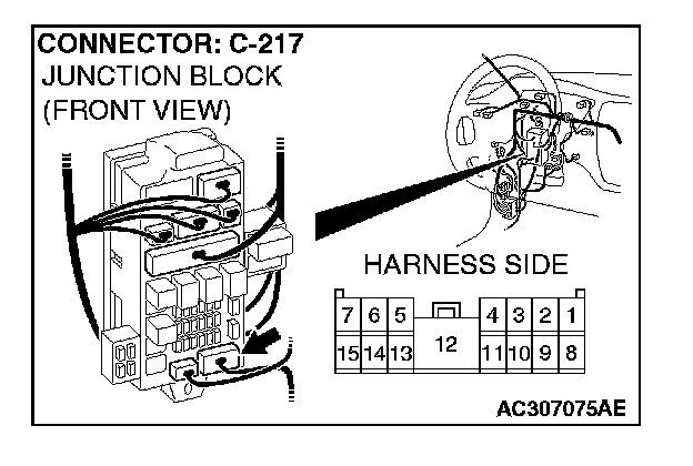 NOTE: Also check junction block connector C-217 for loose, corroded, or damaged terminals, or terminals pushed back in the connector. If junction block connector C-217 is damaged, Repair or replace the damaged component(s) as described in Harness Connector Inspection.