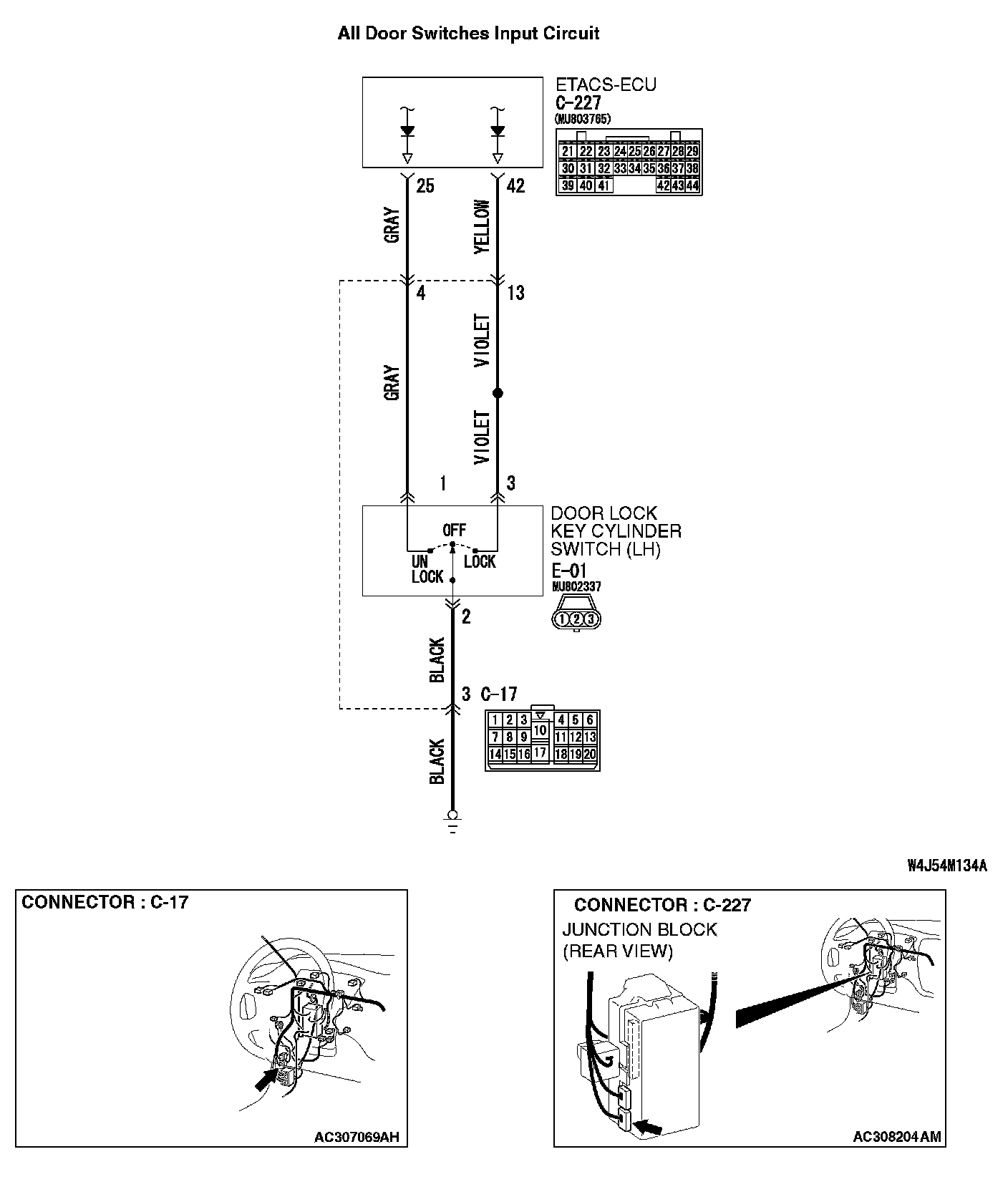 STEP 6. Check the wiring harness between driver's door lock key cylinder switch connector E-01 (terminal 1 and 3) and ETACS-ECU connector C-227 (terminal 25 and 42).
