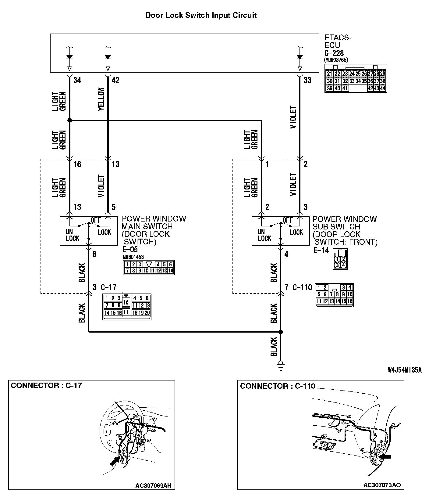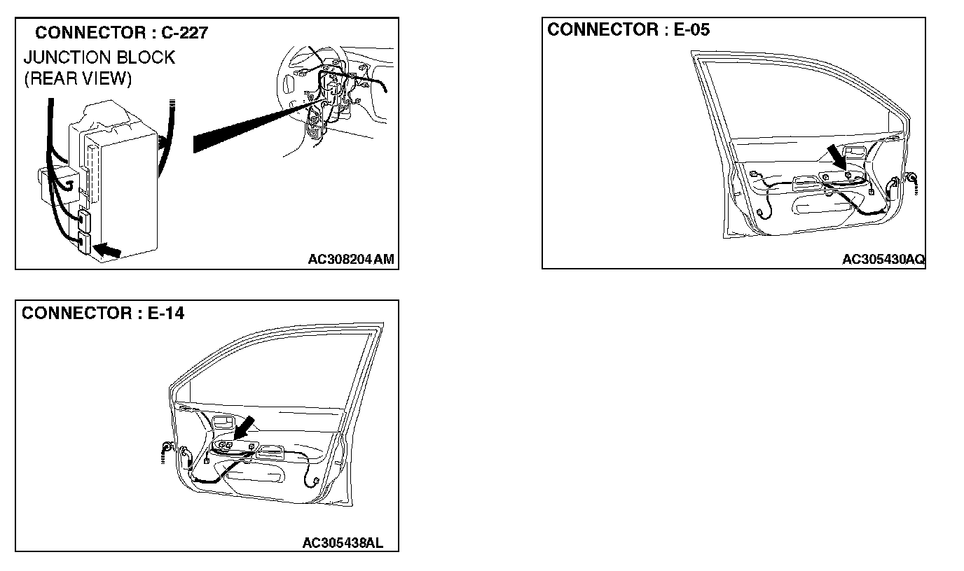 STEP 13. Check the wiring harness between power window sub switch connector E-14 (terminal 2 and 3) and ETACS-ECU connector C-227 (terminal 34 and 33).