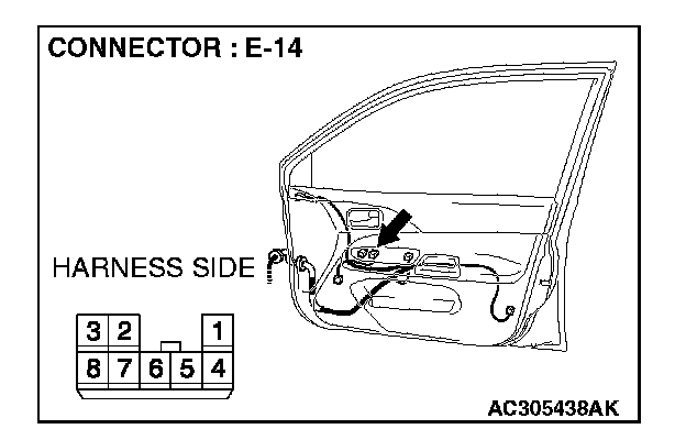 1. Disconnect power window sub switch connector E-14 and measure the resistance available at the wiring harness side of the connector.