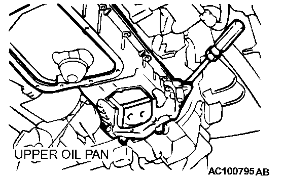 CAUTION: Do not use oil pan remover (MD998727) because the upper oil pan is aluminum. When individual mounting bolts are remove, insert a pry bar into the gap (as shown in the figure) between upper oil pan and cylinder block, and pry off upper oil pan.