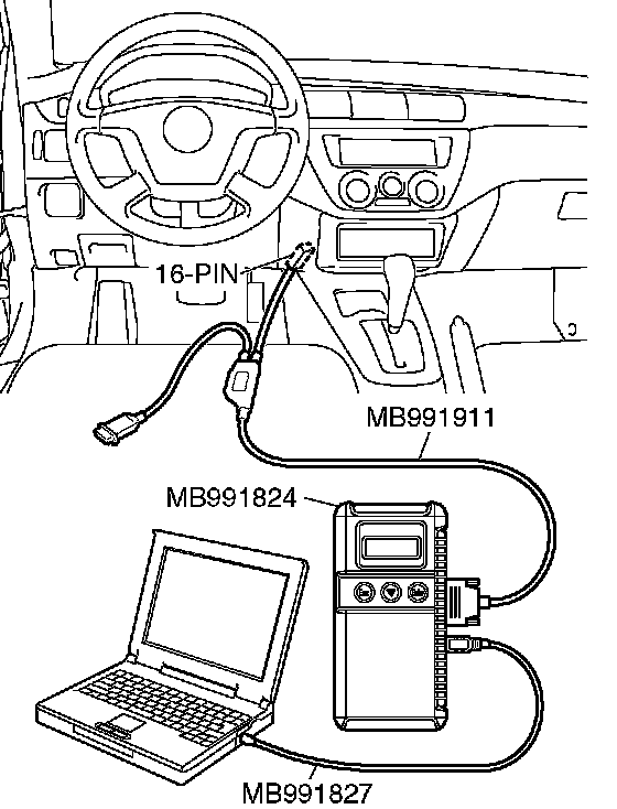 CAUTION: To prevent damage to scan tool MB991958, always turn the ignition switch to the "LOCK" (OFF) position before connecting or disconnecting scan tool MB991958.