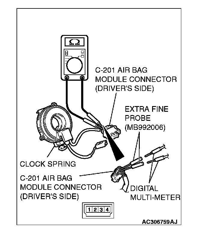 5. As shown in the figure, connect the circuit tester to the special tool (MB992006) and check to see that continuity exists between driver's air bag module terminals 1 and 2 and between terminals 3 and 4.