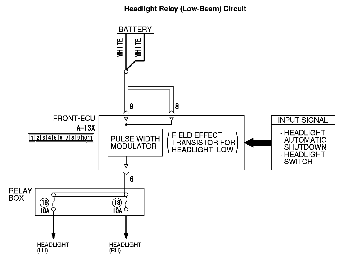 - When the lighting switch is set to "HEAD" position, the "HEAD" signal is sent through the column-ECU (incorporated in the column switch) to the front-ECU. If the front-ECU receives the "HEAD" signal through the column-ECU, the front-ECU turns on the headlight relay (incorporated in the front-ECU), thus causing the headlights to illuminate. The headlights always illuminate at low-beam by the headlight dimmer switch automatic resetting function.