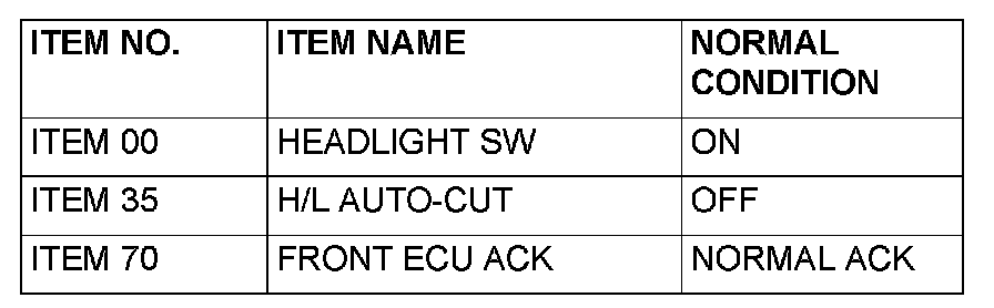 Normal condition is not displayed for "FRONT ECU ACK" : Replace the front-ECU. Verify that the headlights (low-beam) illuminate normally.