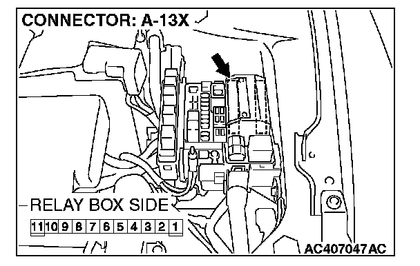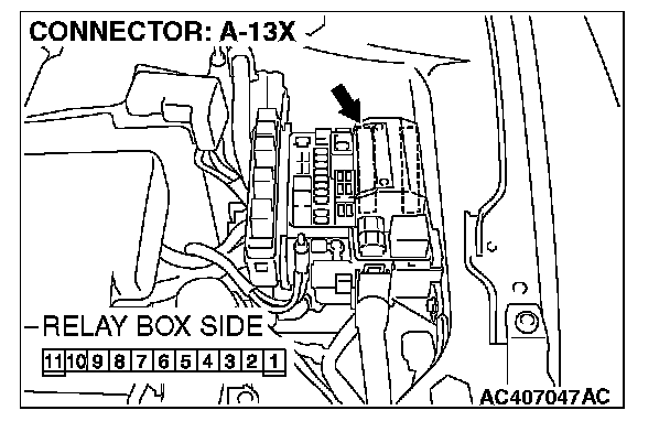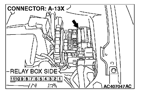 1. Disconnect front-ECU connector A-13X and measure the voltage available at the relay box side of the connector.