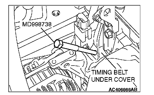 2. Remove the timing belt under cover rubber plug and then set special tool MD998738.