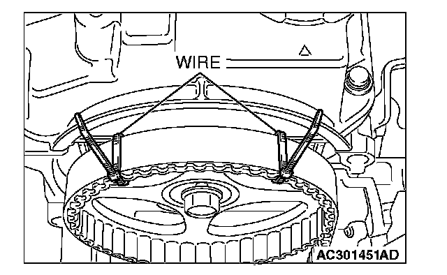 4. Secure the camshaft sprocket and valve timing belt with wire to prevent slippage between the camshaft sprocket and valve timing belt.