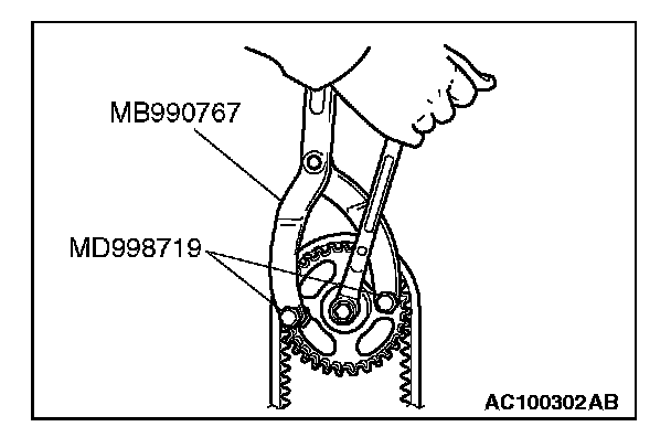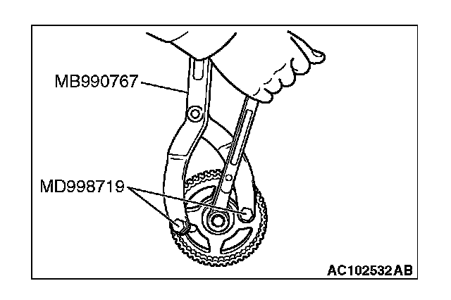 1. Hold the camshaft sprocket with special tools MB990767 and MD998719 in the same manner as removal.