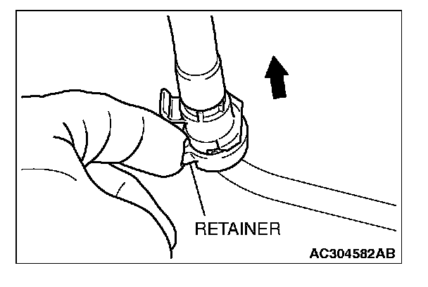 2. Pull up the retainer and remove the fuel high-pressure hose in the direction shown.
