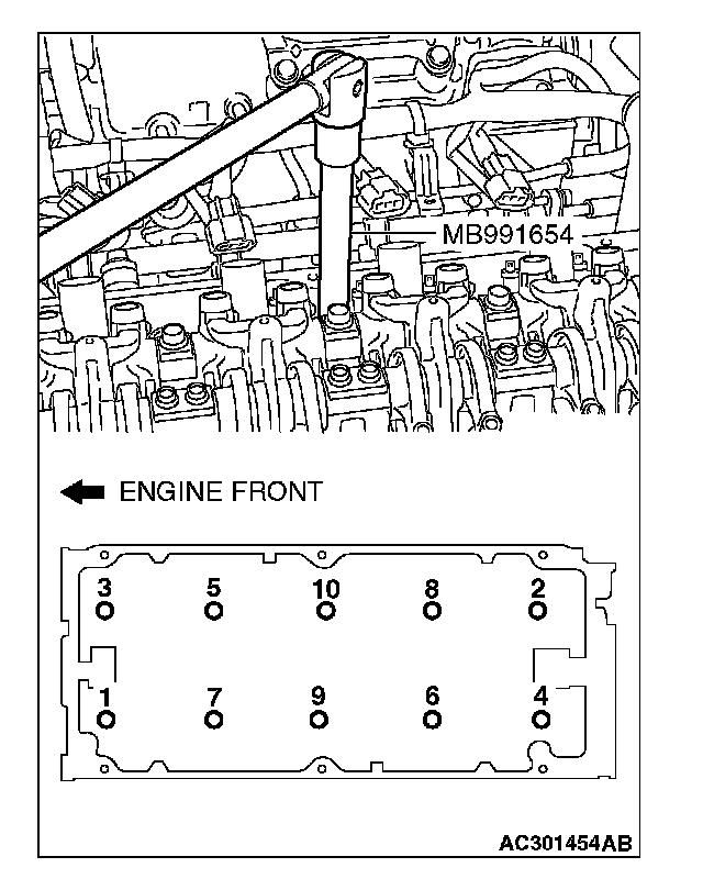 3. Use special tool MB991654 to tighten the cylinder head bolts in the following procedures.