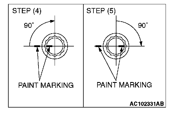 (5) Apply a paint mark to the heads of the cylinder head bolts and cylinder head, then tighten 90 degrees as shown.