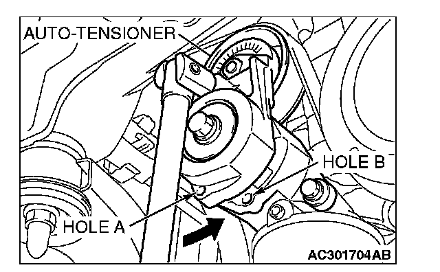 2. Rotate the auto-tensioner counterclockwise and align hole A with hole B.