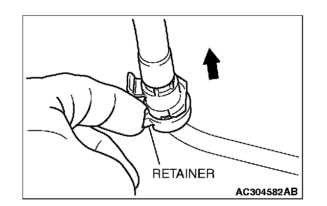 2. Pull up the retainer and remove the fuel high-pressure hose in the direction shown.