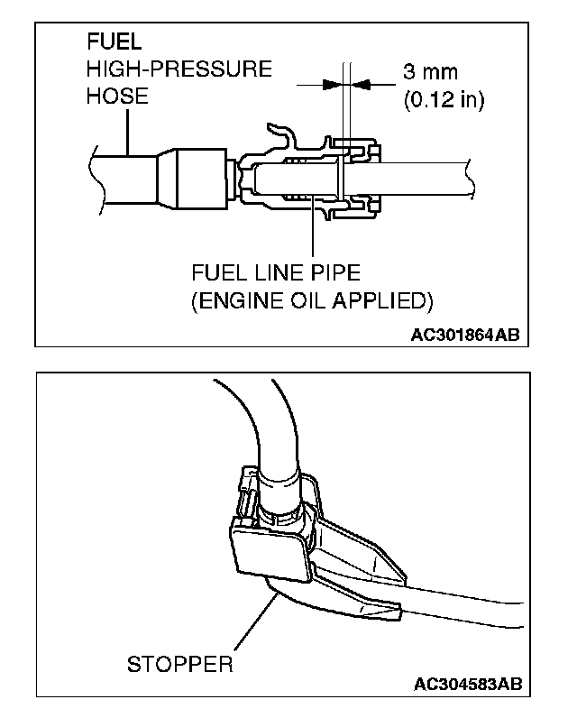 CAUTION: After connecting the fuel high-pressure hose, slightly pull it to ensure that it is installed securely. Also confirm that there is a play of approximately 3 mm (0.12 inch). Then install the stopper securely.