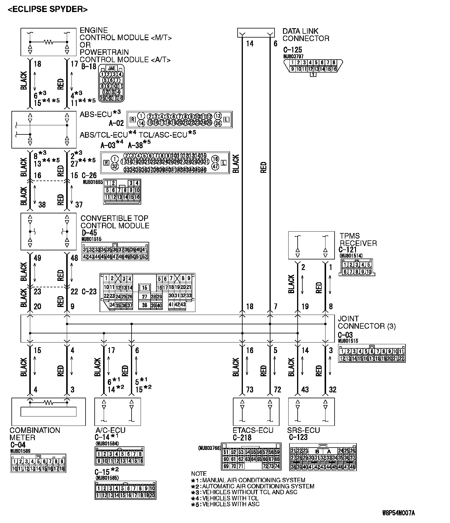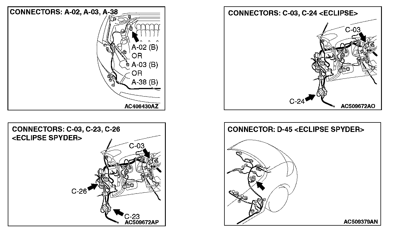 Q: Are joint connector (3) C-03 [ECLIPSE] or convertible top control module connector D-45 [ECLIPSE SPYDER] and ABS-ECU connector A-02 [vehicles without TCL or ASC] or ABS/TCL-ECU connector A-03 [vehicles with TCL] or TCL/ASC-ECU connector A-38 [vehicles with ASC] in good condition?