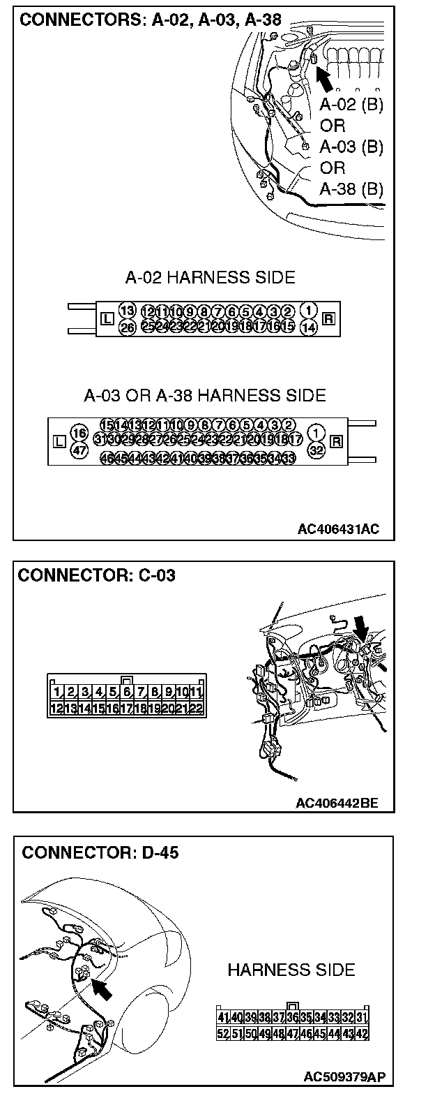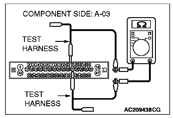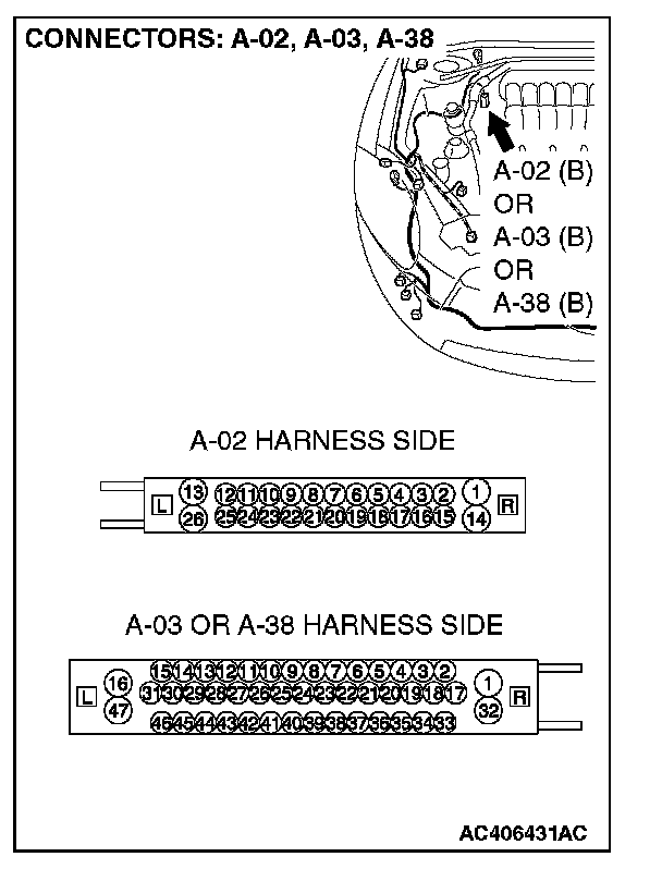 STEP 1. Check joint connector (3) C-03 [ECLIPSE] or convertible top control module connector D-45 [ECLIPSE SPYDER] and ABS-ECU connector A-02 [vehicles without TCL or ASC] or ABS/TCL-ECU connector A-03 [vehicles with TCL] or TCL/ASC-ECU connector A-38 [vehicles with ASC] for loose, corroded or damaged terminals, or terminals pushed back in the connector.