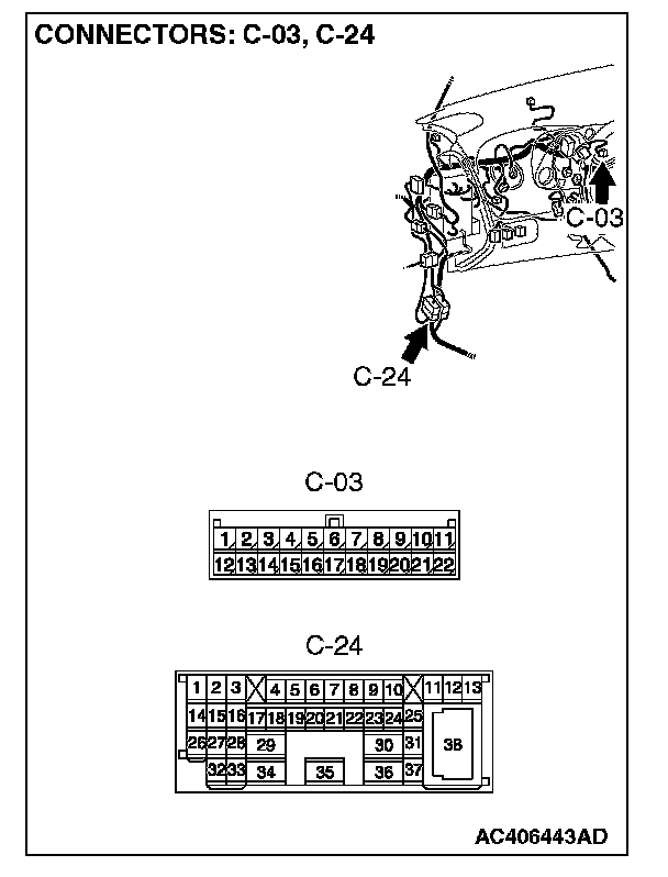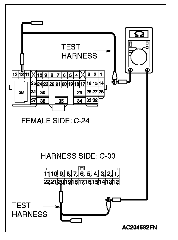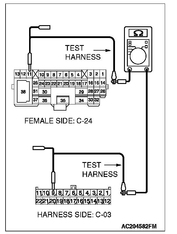 1. Disconnect intermediate connector C-24 and joint connector (3) C-03, and measure the resistance between the wiring harness side connector of joint connector (3) C-03 and the male side connector of intermediate connector C-24 (at front wiring harness side).
