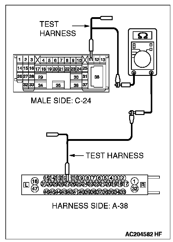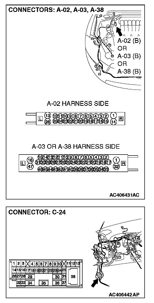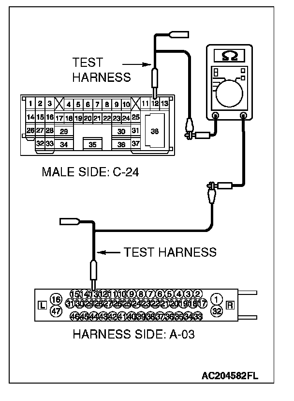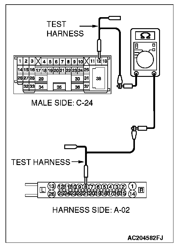 1. Disconnect intermediate connector C-24 and ABS-ECU connector A-02 [vehicles without TCL or ASC] or ABS/TCL-ECU connector A-03 [vehicles with TCL] or TCL/ASC-ECU connector A-38 [vehicles with ASC], and measure the resistance between the wiring harness side connector of ABS-ECU connector A-02 [vehicles without TCL or ASC] or ABS/TCL-ECU connector A-03 [vehicles with TCL] or TCL/ASC-ECU connector A-38 [vehicles with ASC] and the male side connector of intermediate connector C-24 (at front wiring harness side).