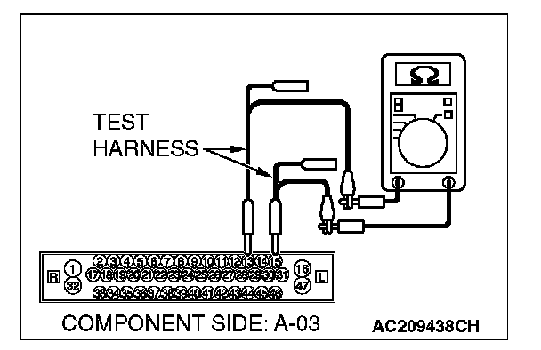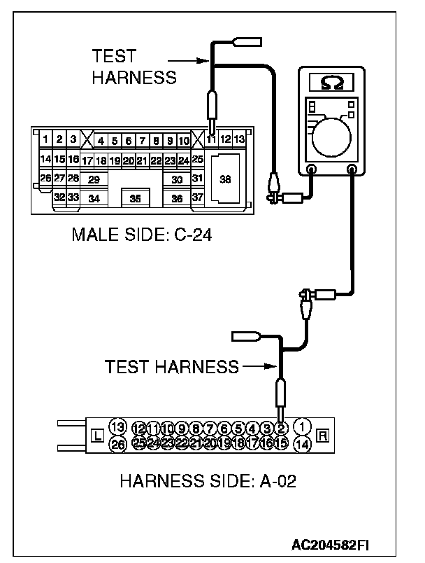 NO : If either of the resistances measures more than 2 ohms or all the resistances measure more than 2 ohms, repair the wiring harness between intermediate connector C-24 and the ABS-ECU [vehicles without TCL or ASC] connector A-02 or ABS/TCL-ECU [vehicles with TCL] connector A-03 or TCL/ASC-ECU [vehicles with ASC] connector A-38.