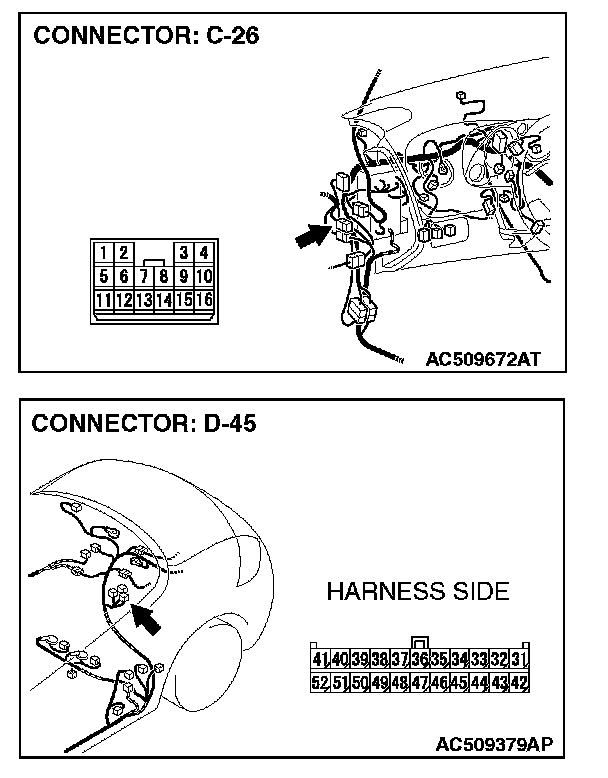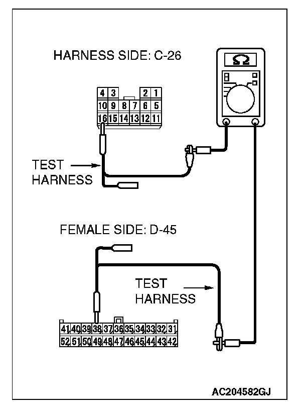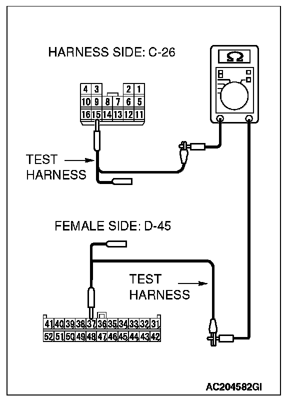 1. Disconnect intermediate connector C-26 and convertible top control module D-45, and measure the resistance between the wiring harness side connector of convertible top control module D-45 and the male side connector of intermediate connector C-26 (at front wiring harness side).