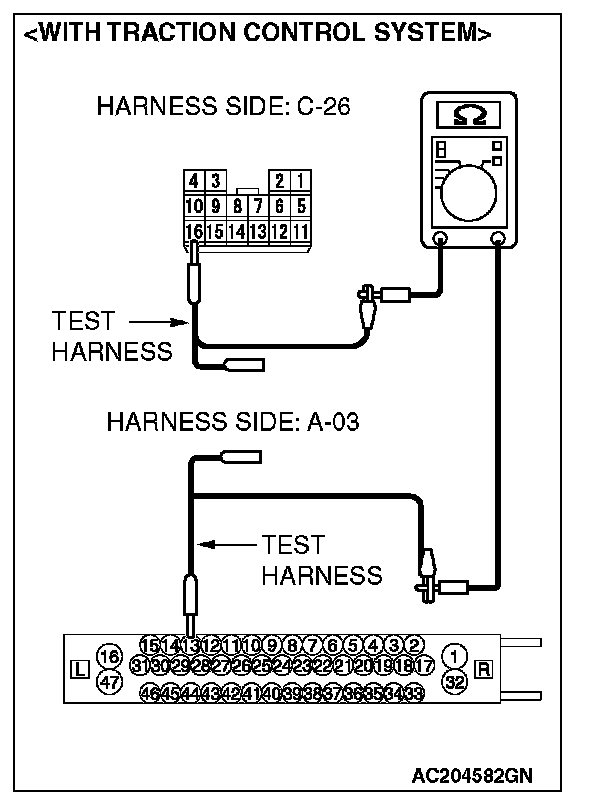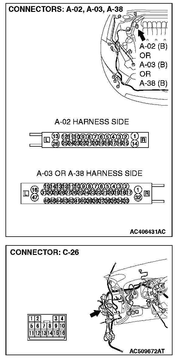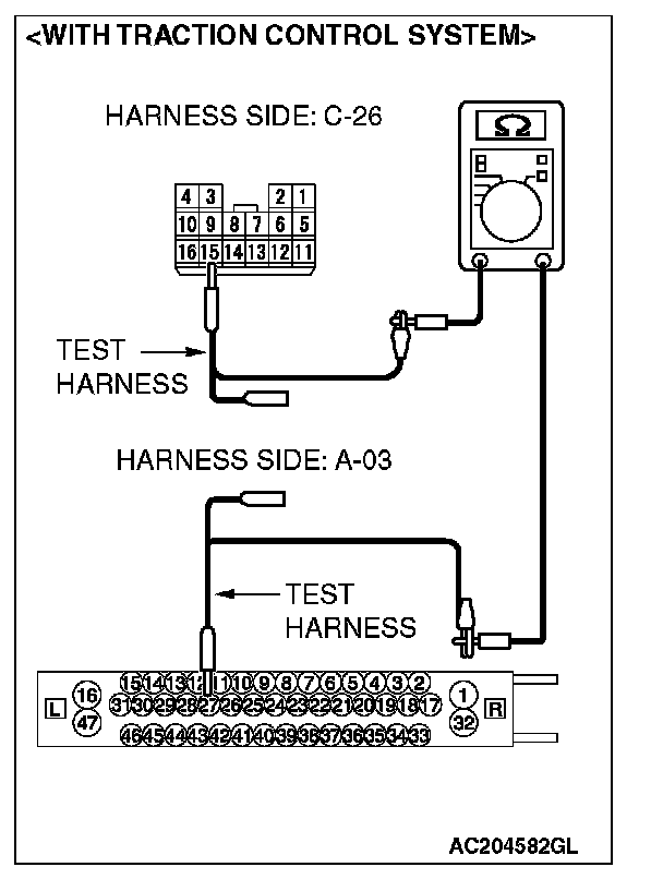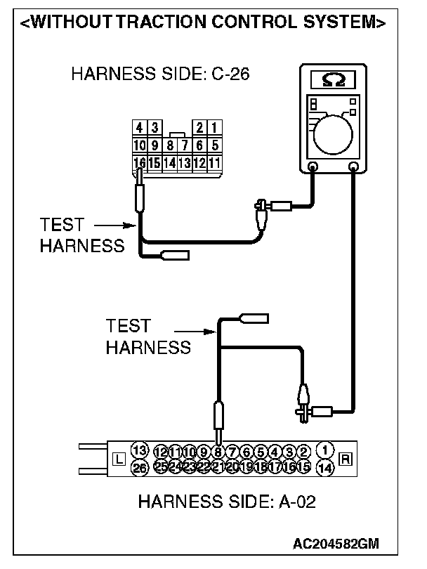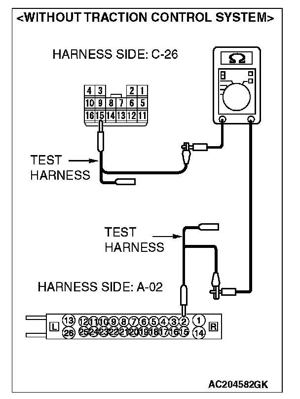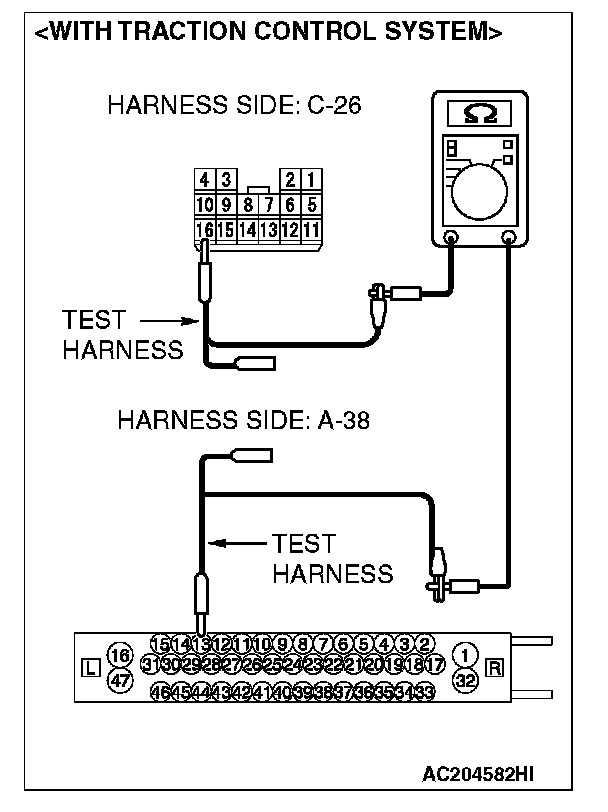 1. Disconnect intermediate connector C-26 and ABS-ECU connector A-02 [vehicles without TCL or ASC] or ABS/TCL-ECU connector A-03 [vehicles with TCL] or TCL/ASC-ECU connector A-38 [vehicles with ASC], and measure the resistance between the wiring harness side connector of ABS-ECU connector A-02 [vehicles without TCL or ASC] or ABS/TCL-ECU connector A-03 [vehicles with TCL] or TCL/ASC-ECU connector A-38 [vehicles with ASC] and the male side connector of intermediate connector C-26 (at front wiring harness side).