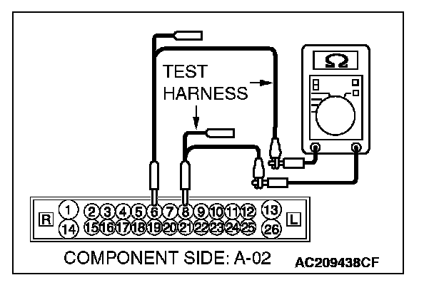 3. Measure the resistance between ABS-ECU [vehicles without TCL or ASC] connector A-02 (terminals 8 and 6).