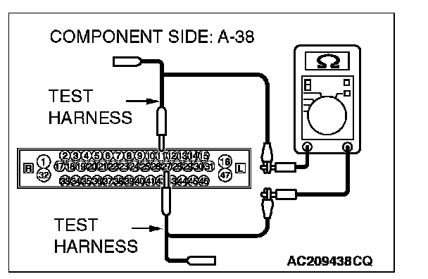 1. Disconnect ABS-ECU connector A-02 [vehicles without TCL or ASC] or ABS/TCL-ECU A-03 [vehicles with TCL] or TCL/ASC-ECU A-38 [vehicles with ASC], and measure the resistance at the component side of ABS-ECU connector A-02 [vehicles without TCL or ASC] or ABS/TCL-ECU connector A-03 [vehicles with TCL] or TCL/ASC-ECU connector A-38 [vehicles with ASC].