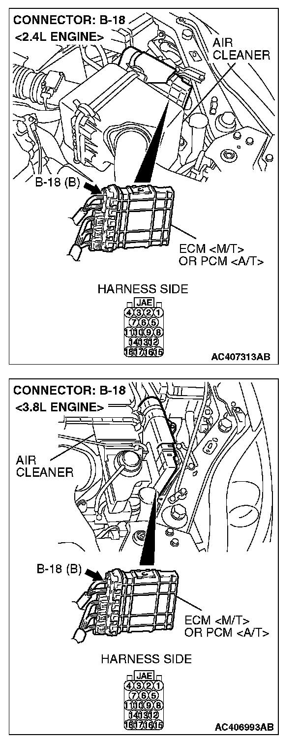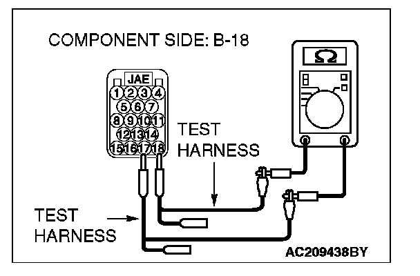1. Disconnect ECM [M/T] or PCM [A/T] connector B-18, and measure the resistance at the component side of ECM [M/T] or PCM [A/T] connector B-18.