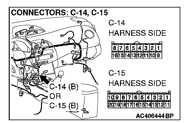 1. Disconnect A/C-ECU connector C-14 [manual air conditioning system] or C-15 [automatic air conditioning system].