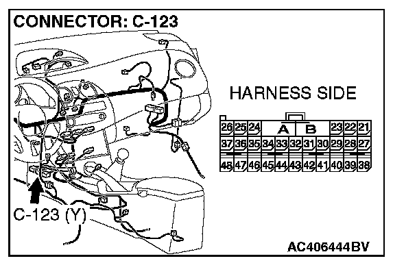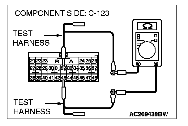 2. Disconnect SRS-ECU connector C-123, and measure the resistance at the component side of SRS-ECU connector C-123.