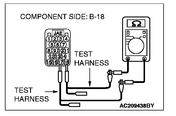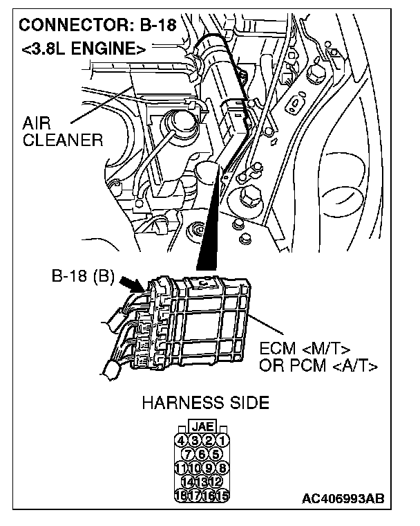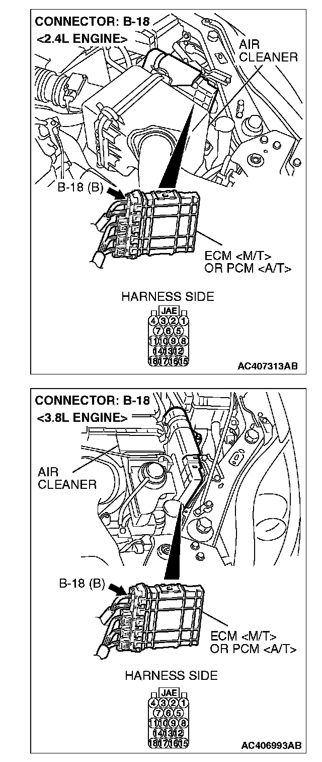 2. Disconnect ECM [M/T] or PCM [A/T] connector B-18, and measure the resistance at the component side of ECM [M/T] or PCM [A/T] connector B-18.