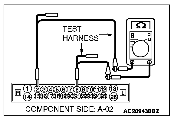 3. Measure the resistance between ABS-ECU connector terminals 2 and 8. [vehicles without TCL or ASC]