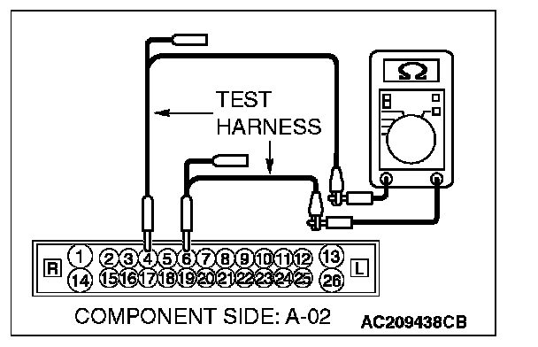 2. Disconnect ECM connector [M/T] or PCM connector [A/T] B-18 and ABS-ECU connector A-02 [vehicles without TCL or ASC] or ABS/TCL-ECU connector A-03 [vehicles with TCL] or TCL/ASC-ECU connector A-38 vehicles with ASC, and measure the resistance at the harness side of ABS-ECU connector A-02 [vehicles without TCL or ASC] or ABS/TCL-ECU connector A-03 [vehicles with TCL] or TCL/ASC-ECU connector A-38 [[vehicles with ASC].