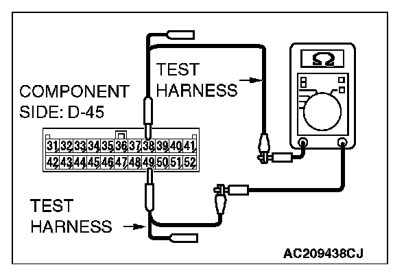 4. Measure the resistance between convertible top control module connector D-45 (terminals 38 and 49).