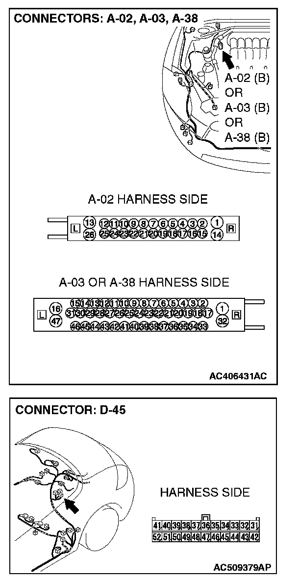 2. Disconnect convertible top control module D-45 and ABS-ECU connector A-02 [vehicles without TCL or ASC] or ABS/TCL-ECU connector A-03 [vehicles with TCL] or TCL/ASC-ECU connector A-38 [vehicles with ASC], and measure the resistance at the harness side of ABS-ECU connector A-02 [vehicles without TCL or ASC] or ABS/TCL-ECU connector A-03 [vehicles with TCL] or TCL/ASC-ECU connector A-38 [vehicles with ASC].