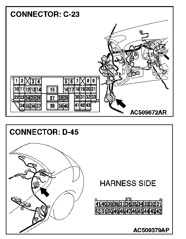 2. Disconnect intermediate connector C-23 and convertible top control module connector D-45, and measure the resistance at the male side of intermediate connector C-23 (at front wiring harness side).