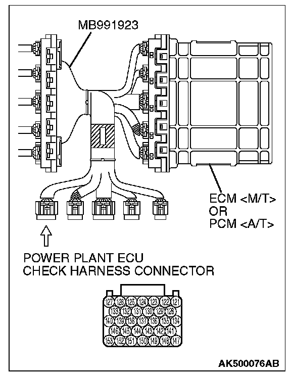 1. Disconnect all ECM [M/T] connectors or PCM [A/T] connectors. Connect the check harness special tool (MB991923) between the separated connectors.