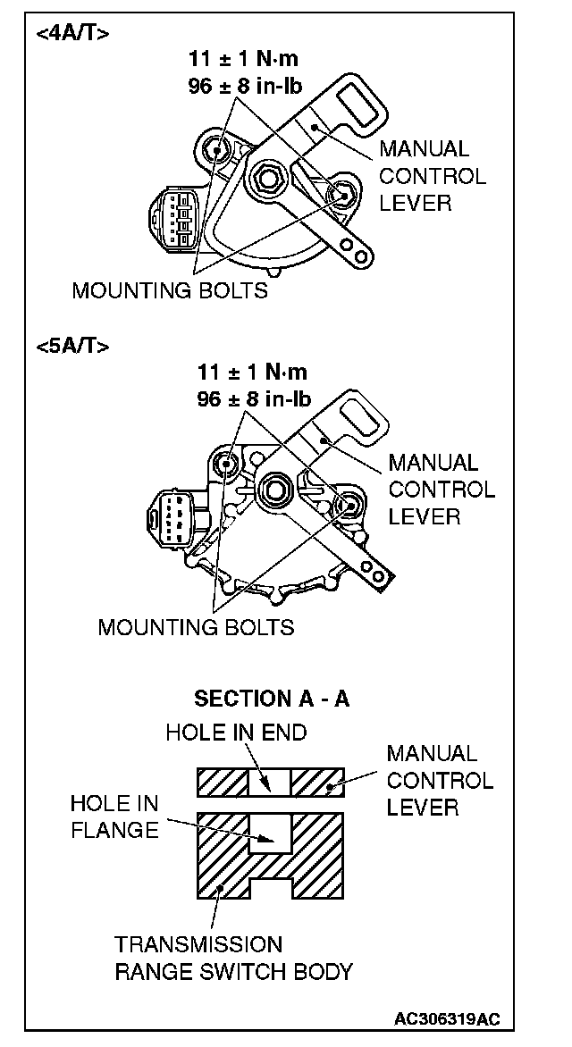 4. Loosen the transmission range switch body mounting bolts and turn the park/neutral position switch body so the hole in the end of the manual control lever and the hole (section A - A in the figure on the left) in the flange of the transmission range switch body flange are aligned.