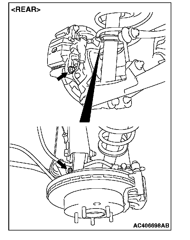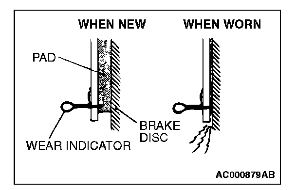DISC BRAKE PAD CHECK AND REPLACEMENTNOTE: The brake pads (LH wheel) have indicators that contact the brake disc when the brake pad thickness becomes 2 mm (0.08 inch), and emit a squealing sound to warn the driver.